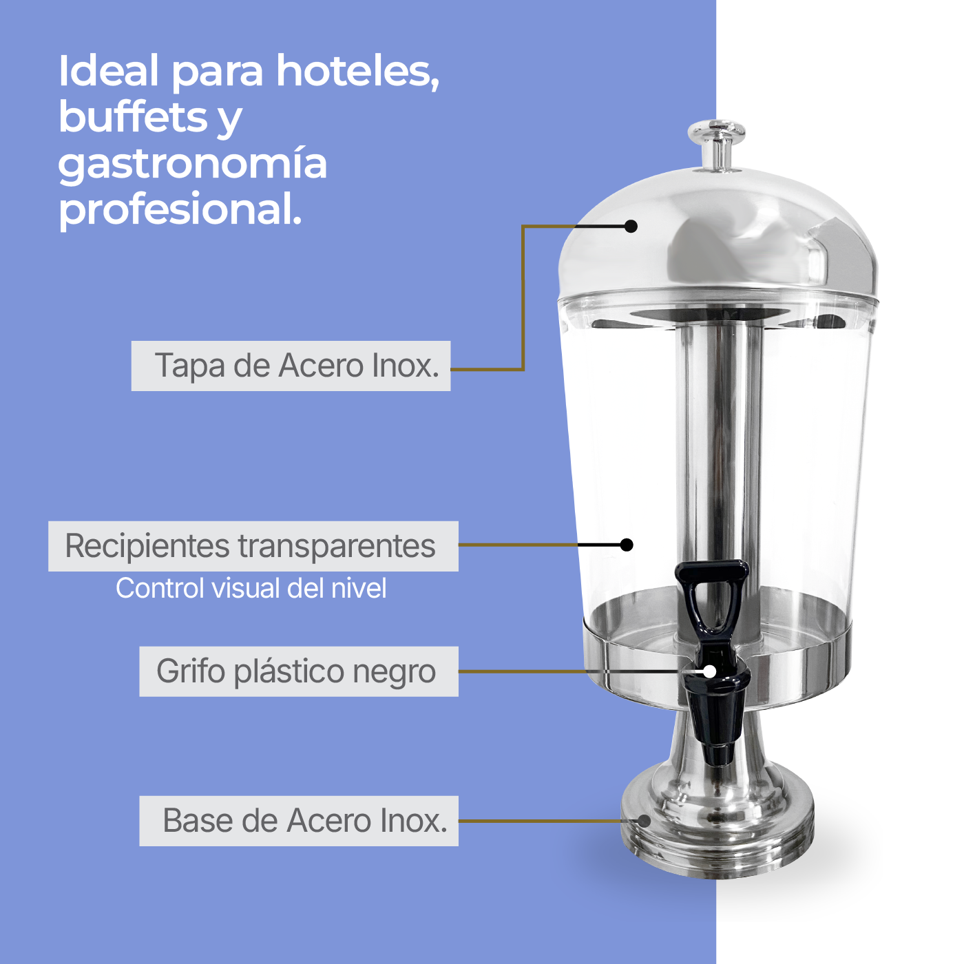 Diseñado para un rendimiento superior, este dispenser cuenta con tres depósitos de 8 litros cada uno, fabricados en policarbonato resistente y una base de acero inoxidable S304, garantizando durabilidad y una higiene impecable. Incluye cilindros internos para hielo que mantienen sus bebidas perfectamente frías sin diluirlas, y bandejas de goteo extraíbles para una limpieza sencilla. Es ideal tanto para uso profesional en buffets y hoteles como para eventos domésticos de alta categoría.